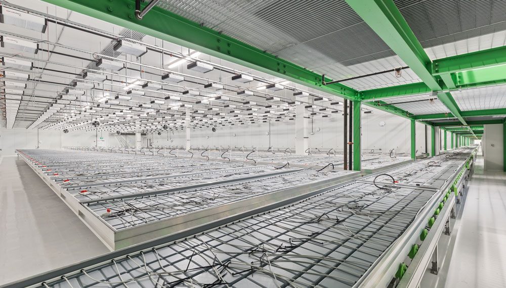 The six massive grow rooms are built with Norbec insulated metal panels and epoxy flooring, which help maintain the clean environment critical to cultivation. Each grow room has 24 separate fertigation zones and four lighting zones to maximize growth of healthy plants. More than 2,200 LED lights from Revolution Microelectronics illuminate the grow conditions.